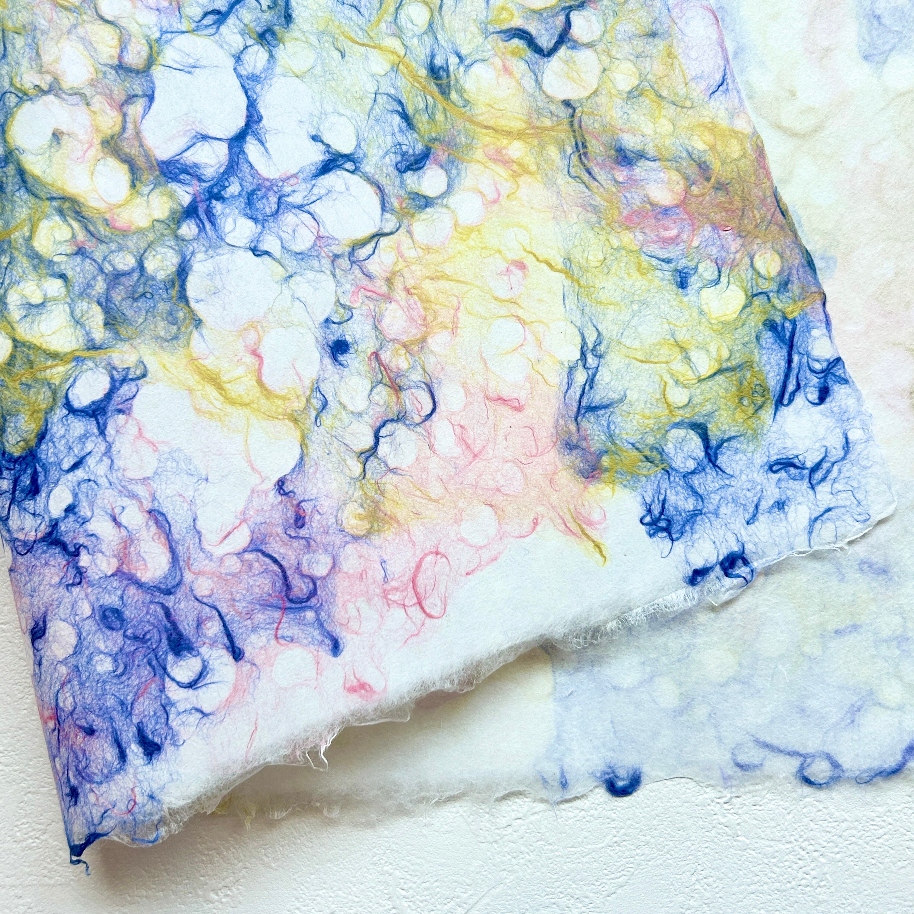 埼玉県小川町で作られた、青・ピンク・黄緑の繊維が漉き込まれている和紙です。